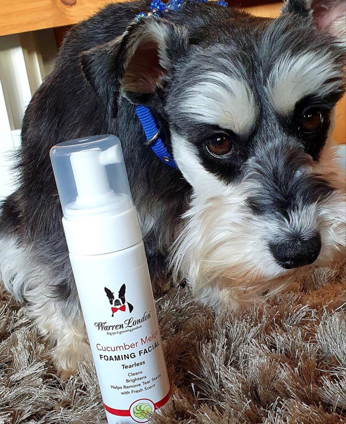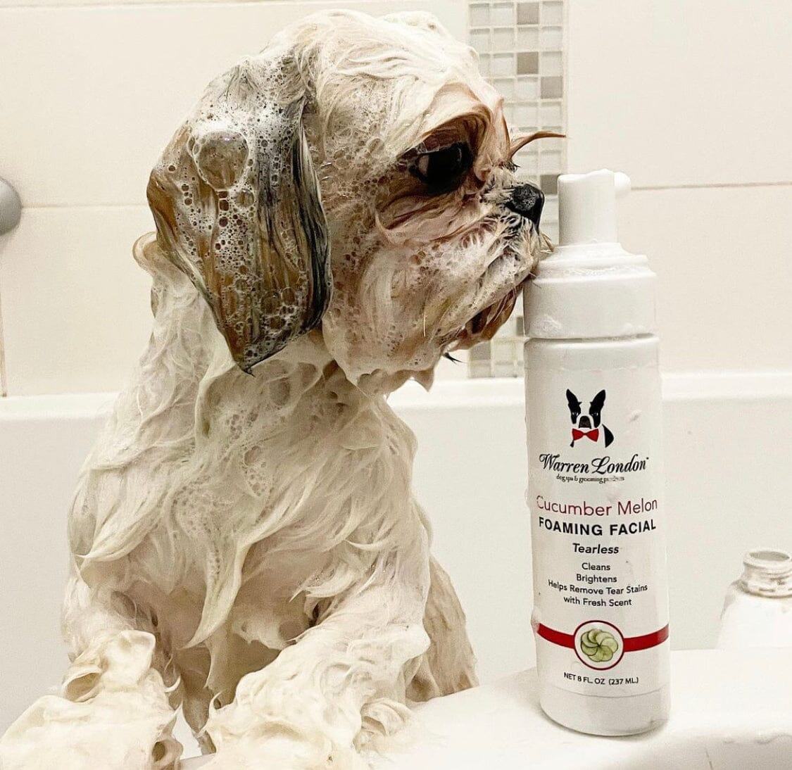 Directions: After wetting your dog's face, pump foaming facial into your hand or cloth. Slowly apply the products to the outer ears, face and neck. Avoid the eyes by at least 1 inch. Slowly massage into face in a circular motion for up to two minutes. Rinse thoroughly with warm water and repeat for best results.