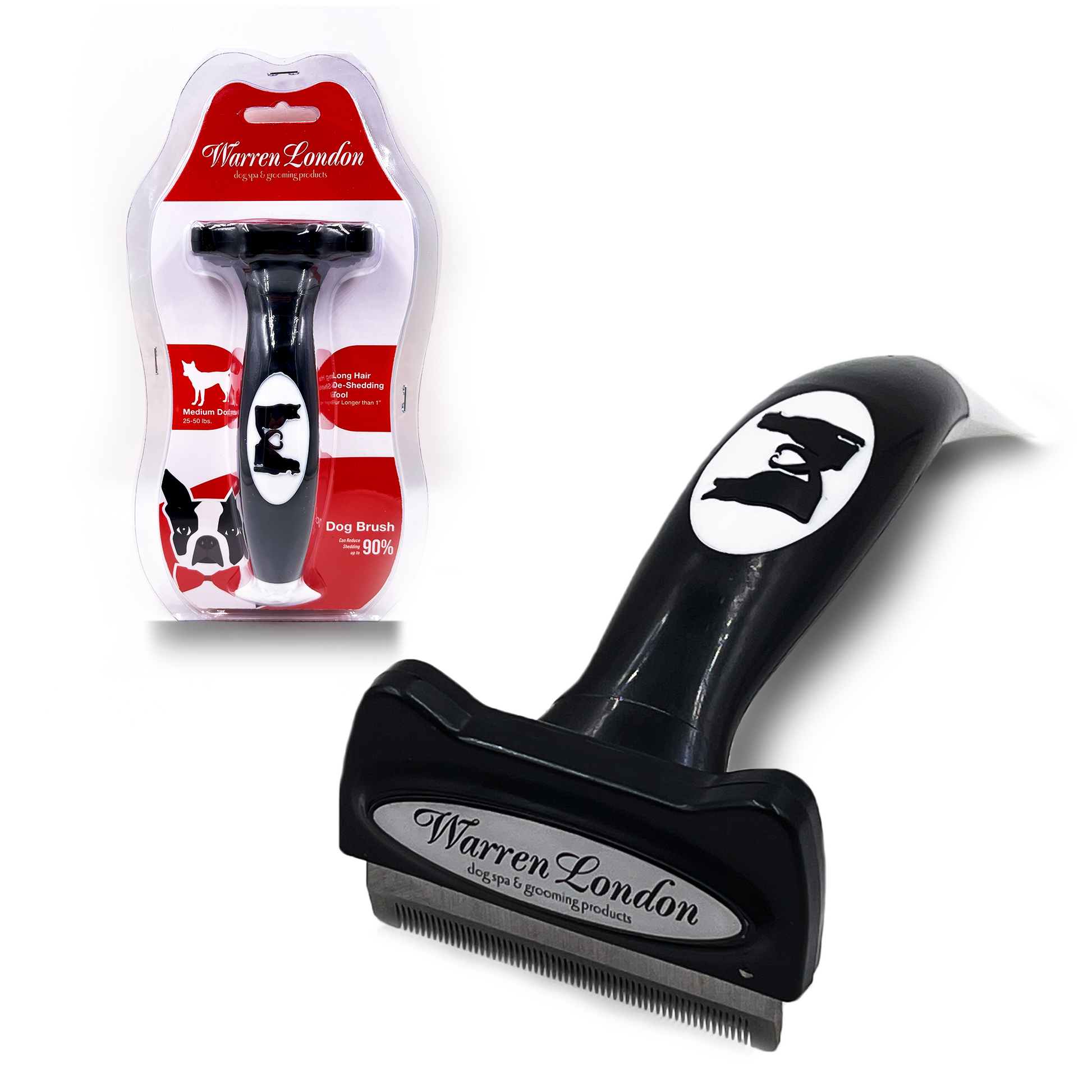 Keep your furry friends shedding to a minimum with Warren London's Dog Spa & Grooming's Deshedding Brush. This high-quality grooming brush with an ergonomic grip allows our sturdy steel blades brush away hair from your pet's undercoat while also being safe for your dogs skin as our combs comes to a flat tip. This brush can work great on your cat as well! Our brush reduces shedding better than any rake, brush or comb. Use on any hair type as we have brushes for both short and long hair dogs that comes in 3 different sizes. Reduce shedding and keep your dogs coat looking its best with Warren London's Deshedding Brush.
