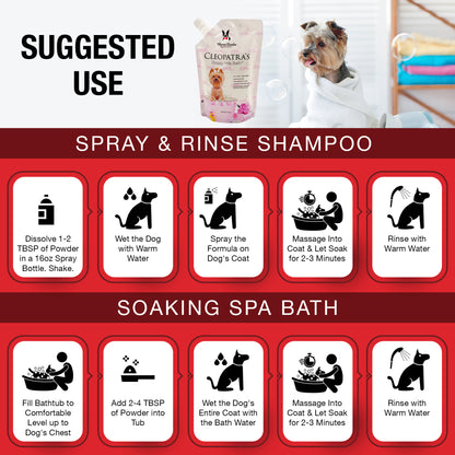 • Two Unique Applications - Either Soak or Spray-On - Dissolve the Powdered Milk Bath in a bath tub to soak and apply like a traditional Dog Shampoo - Or Dissolve the Powder in a Spray Bottle to Spray-On, Brush-Through, and Rinse-Out.