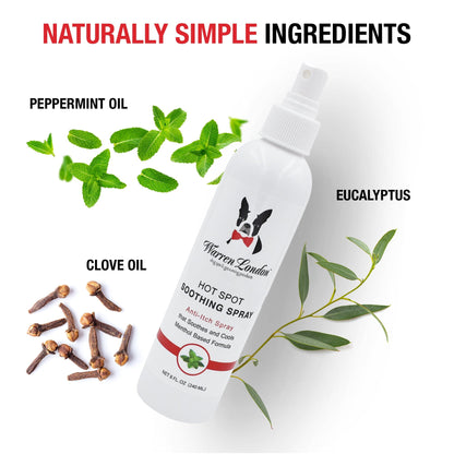 - Naturally Cleans & Rejuvenates Hot Spot Irritation - The blend of Botanical Ingredients and Natural Essential Oils restore skin to address the redness & irritation that causes itching, chewing, and gnawing. Infused with Menthol, Clove Oil, Eucalyptus, and Peppermint Oil.